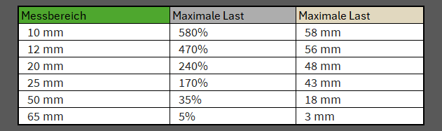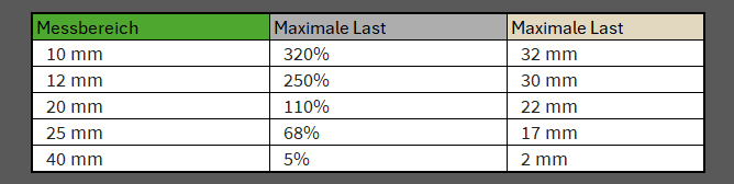 - Die geschätzte maximale Zugdehnung für eine bestimmte Messlänge finden Sie in der Tabelle weiter unten
